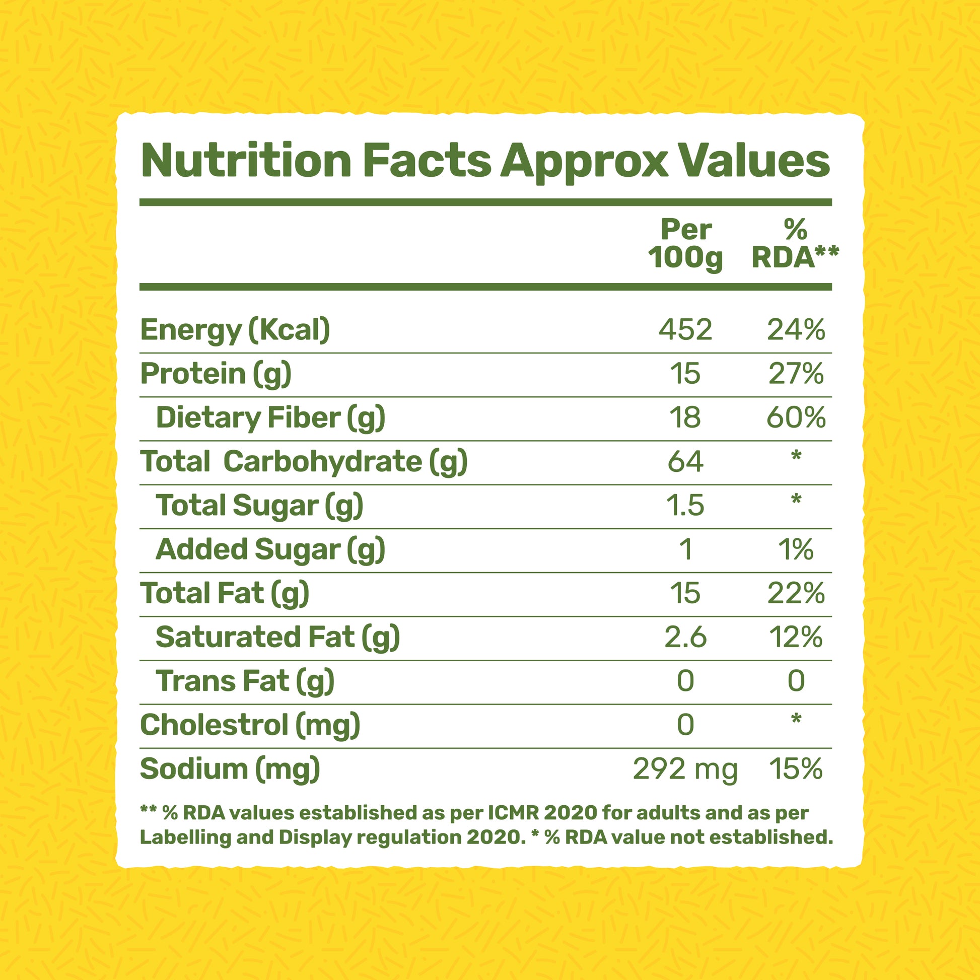 This fresh take on the classic delivers a flavorful burst of pudina and spice, with a crunchy bite and 3x less oil. Backed with 15g protein and 18g fiber per 100g, it’s your snack-time favorite, minus the junk.